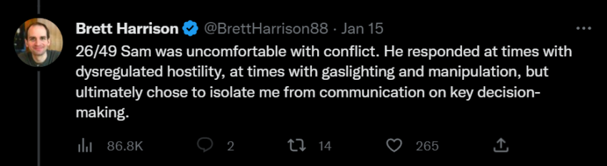 Обвиняемый в мошенничестве создатель обанкротившейся криптобиржи FTX Сэм Бэнкман-Фрид прибегал к враждебности, газлайтингу (обесцениванию труда) и манипуляциям по отношению к своим коллегам. Об этом в «Твиттере» сообщил экс-президент FTX.US Бретт Харрисон.