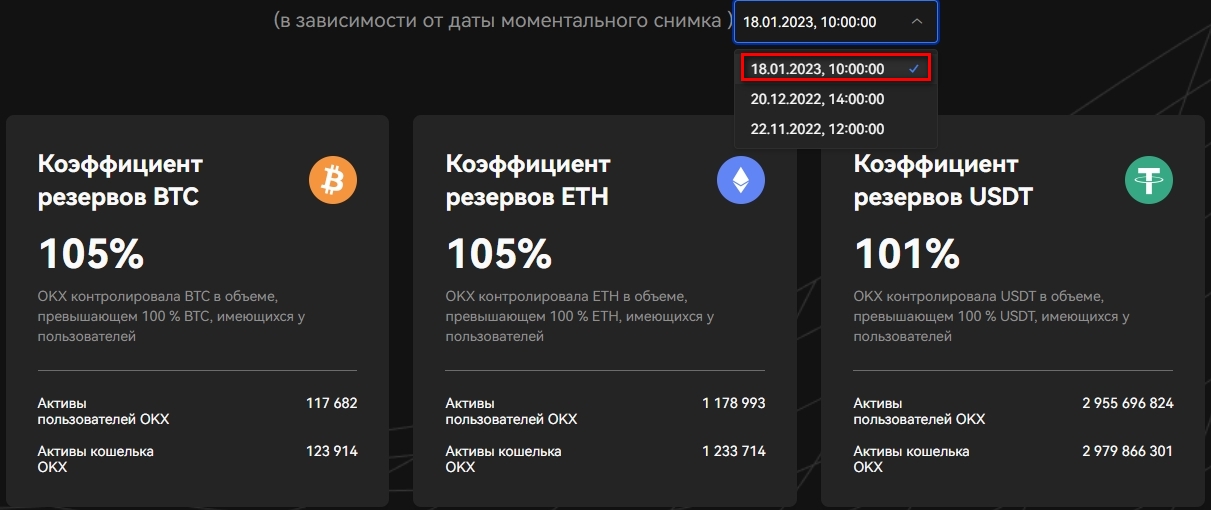 Согласно снапшоту на 18 января, депозиты клиентов подвержены резервами в BTC и ETH на 105%, а в USDT — на 101%. Суммарный показатель коэффициента обеспечения вырос по сравнению с предыдущим месяцем.