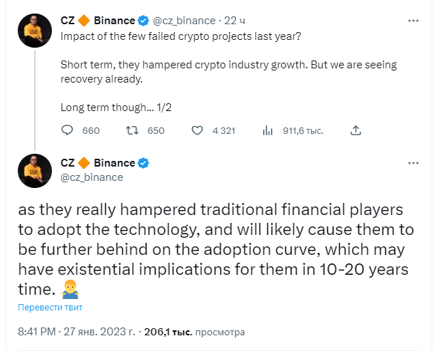 Крах FTX и Terraform Labs снизил доверие инвесторов и вынудил традиционный рынок пересмотреть свои стратегии выхода в криптопространство, что является сдерживающим фактором для принятия криптовалюты в краткосрочной перспективе. CZ полагает, что эта ситуация будет иметь негативные отголоски в течение двух последующих десятилетий.