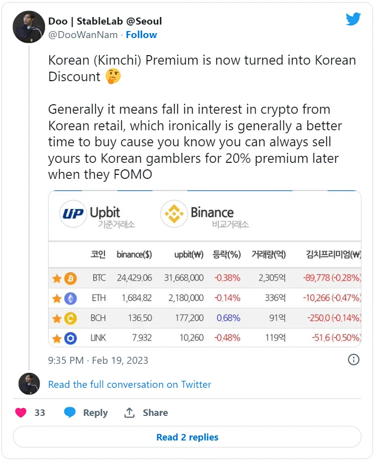 Что произошло? «Премия Кимчи» (Korea Premium Index) в Южной Корее ушла в минус в третий раз с начала года. Это означает, что биткоин и другие криптовалюты теперь дешевле покупать на южнокорейских биржах. По данным исследовательской компании CryptoQuant, показатель в период с 17 по 19 февраля колебался в диапазоне от -0,24 до 0,01. На 20 февраля 11:50 мск курс BTC на криптобиржах Binance и Coinbase составил $24 498 и $24 482 соответственно. Для сравнения, на корейской Bithumb актив котировался по $24 452, а одна из крупнейших платформ, Upbit, торговала биткоином по $24 464.