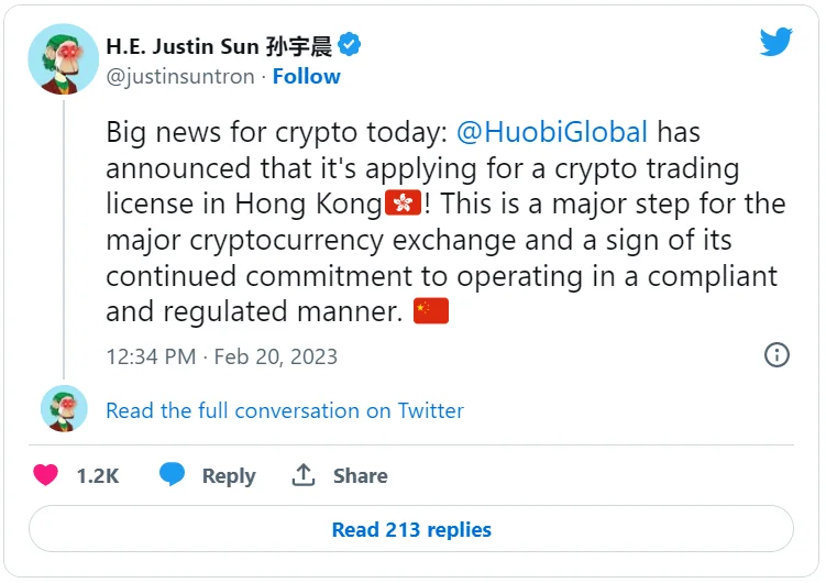 Что произошло? 20 февраля курс нативного токена криптовалютной биржи Huobi вырос на 21,8%. Это произошло после того, как глава платформы и основатель блокчейна TRON Джастин Сан заявил, что Huobi подала заявку на получение лицензии для торговли криптовалютами в Гонконге. На 16:55 мск HT торгуется по $6,3, достигнув максимальной отметки за прошедшие 30 дней, согласно данным агрегатора CoinGecko.