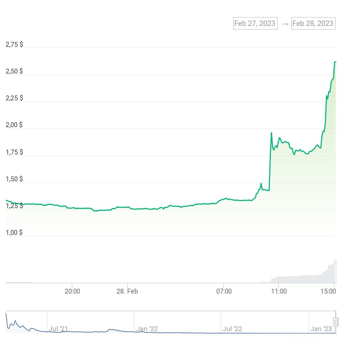 Цена нативного токена LQTY децентрализованной платформы заимствования Liquity выросла в цене на 46% после сообщения Binance о листинге. Менее чем за час курс LQTY повысился с $ 1,4208 до $ 2,075, затем произошла коррекция до уровня $ 1,85.