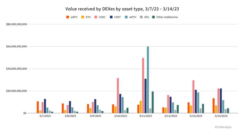 Крах банков Silvergate Bank, Silicon Valley Bank и Signature Bank вдобавок к инциденту вокруг стейблкоина USD Coin (USDC) сыграл на руку децентрализованным биржам. Об этом на официальном сайте сообщили аналитики ончейн-фирмы Chainalysis.