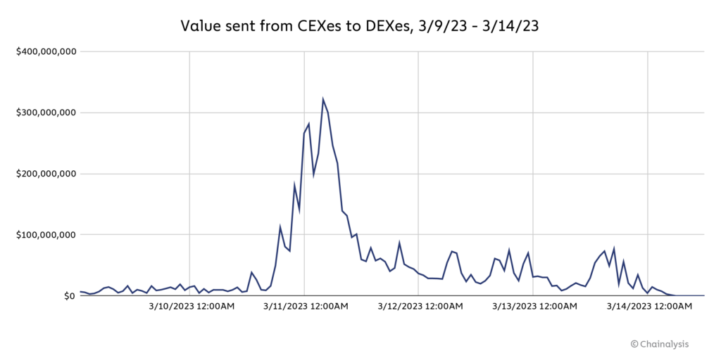 Опубликованные данные говорят о том, что в разгар отвязки USDC от доллара США пользователи поспешили вывести криптовалюту с централизованных бирж. Такая активность отражала опасения о том, что биржи могут рухнуть по примеру банков, считают в Chainalysis. В моменте среднечасовой объем вывода криптовалют с централизованных бирж достиг отметки в $1,2 млрд, подсчитали аналитики.