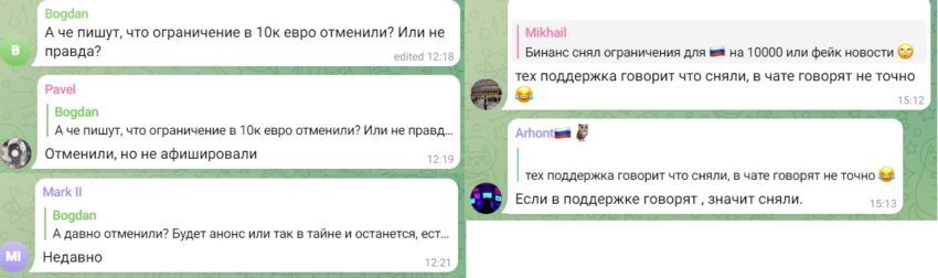 Новость о том, что Binance якобы сняла с россиян лимит в 10 000 евро, начали активно обсуждать в Телеграм-канале криптобиржи. Некоторые участники криптосообщества считают, что на самом деле ограничений больше нет – просто торговая платформа решила не афишировать изменения. Свою точку зрения они объясняют тем, что служба поддержки Binance однозначно утверждает, что лимиты сняли.
