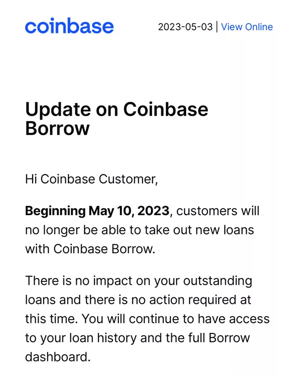 С 10 мая Coinbase завершит кредитование под залог биткоина через сервис Borrow. Соответствующие уведомления получили клиенты криптобиржи, пишет Cointelegraph.