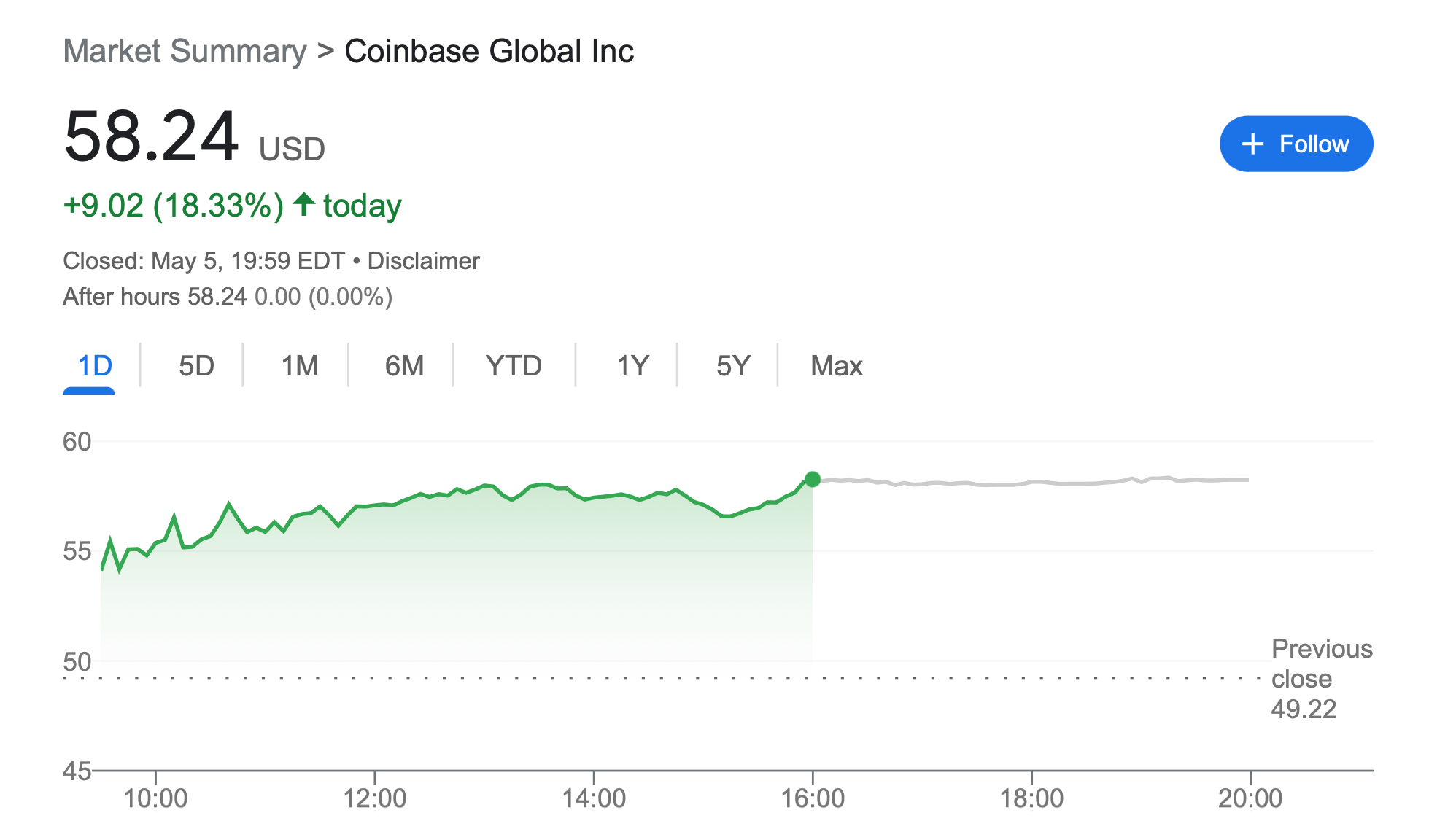 Более хорошие квартальные результаты для финансовой отчётности стали позитивным сюрпризом для многих и превзошли ожидания некоторых аналитиков. Это привело к росту стоимости акций Coinbase на 18 процентов за сутки.