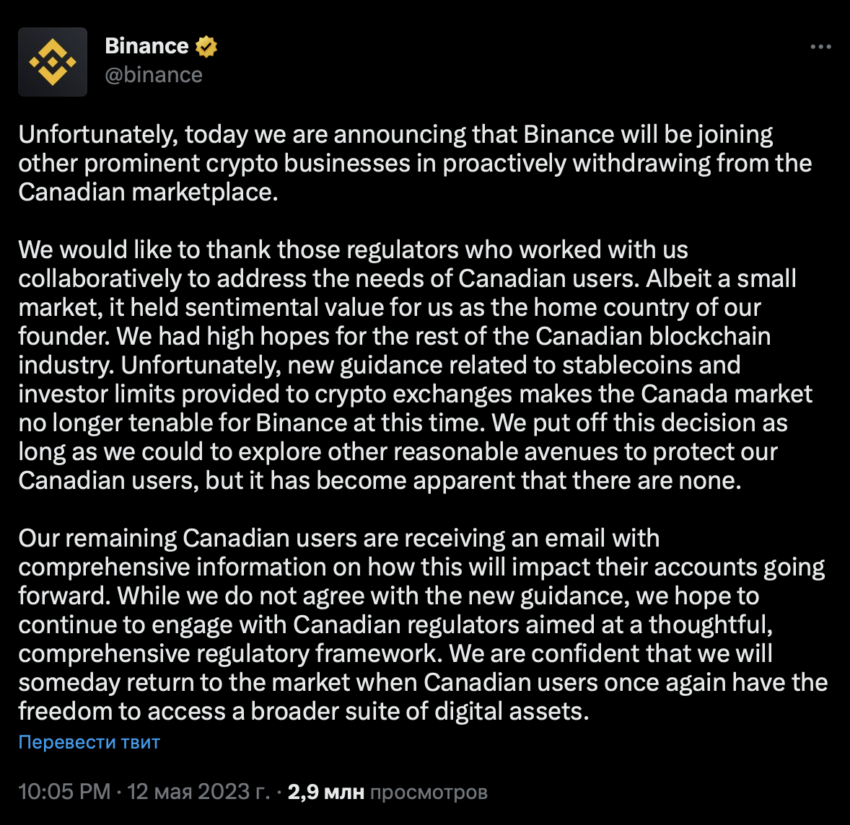 Криптовалютная биржа Binance объявила о прекращении деятельности в Канаде, ссылаясь на сложную нормативную среду.