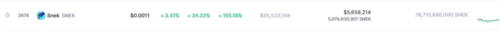 Согласно CoinMarketCap, за последние 24 часа цена SNEK прибавила 34%, за неделю актив подорожал на 155%.