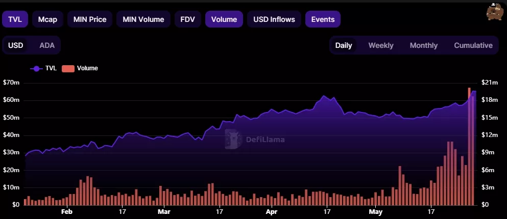 Суточный объем торгов на децентрализованной бирже Minswap подскочил до максимума на отметке $20,93 млн с уровней около $1-2 млн начала мая.