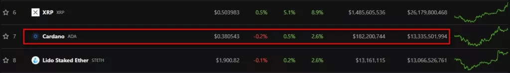 В рейтинге CoinGecko монета Cardano занимает седьмое место по капитализации с показателем $13,34 млрд.