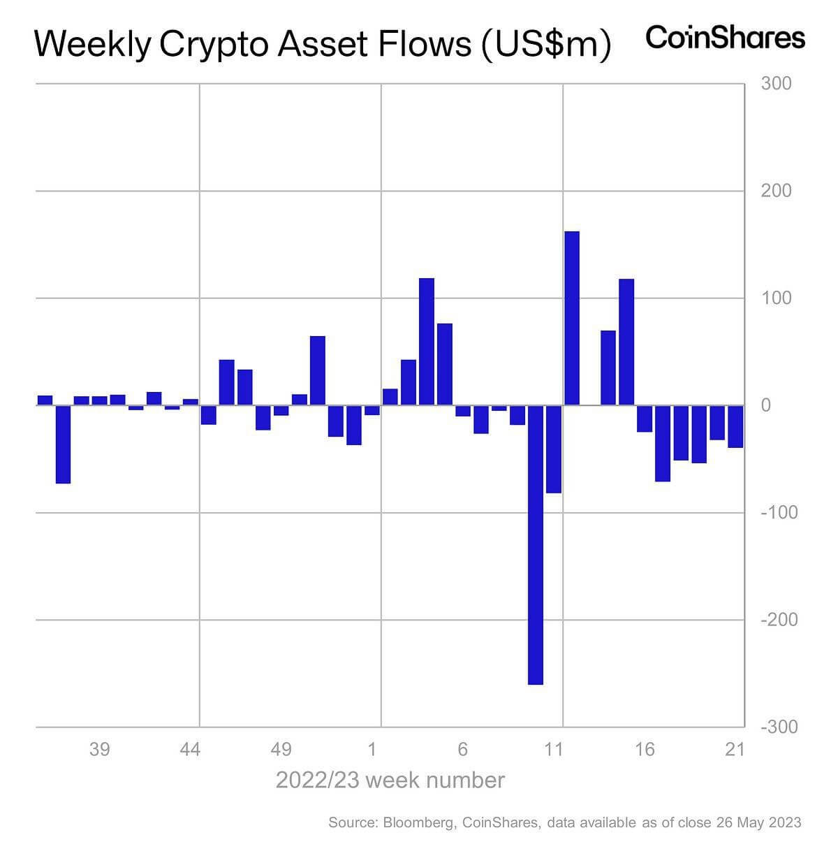 Вместе с этим наблюдается и отток средств из инвестиционных криптовалютных продуктов для крупных инвесторов. За прошлую неделю его эквивалент составил 39 миллионов долларов.