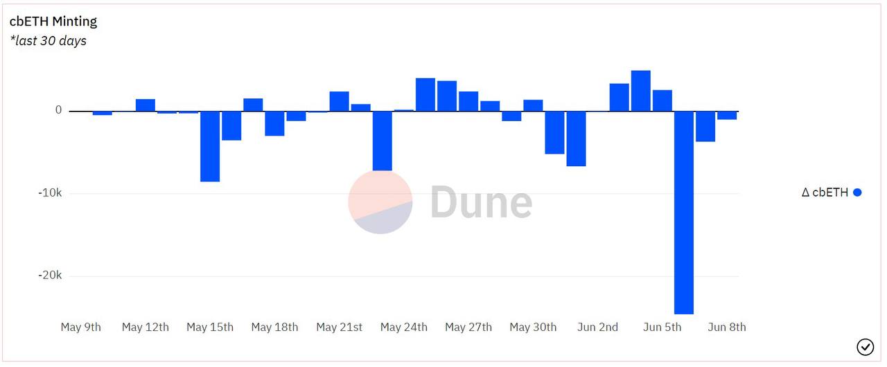 После этого судебного иска Dune Analytics зафиксировала десятки тысяч погашений CBETH на Coinbase, это продукт биржи для стейкинга эфира. В тот день было погашено 27 280 CBETH, а на следующий — почти 9 000 CBETH. 8 июня в погашениях участвовало более 3400 CBETH.