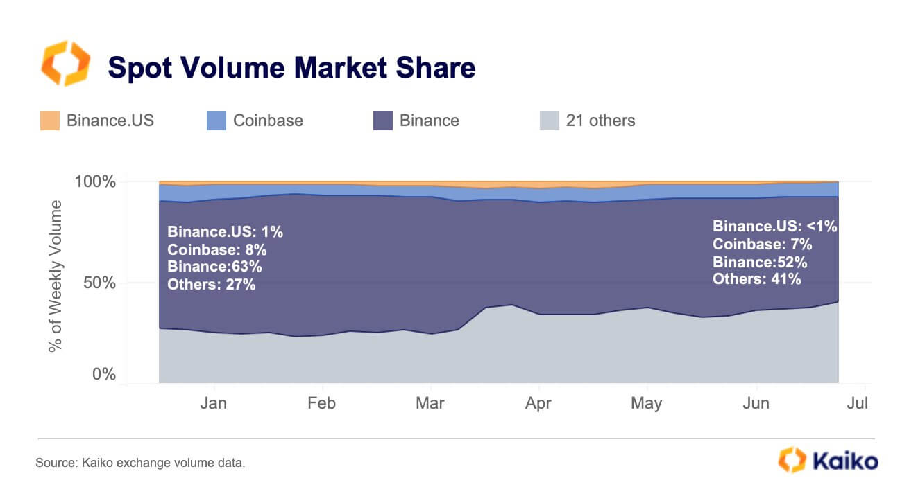 В целом позиции Binance позволяют ей по-прежнему опережать конкурентов. В частности, в июне на торговую платформу пришлось 52 процента всех торговых объёмов внутри индустрии. Однако здесь стоит отметить, что в начале 2023 года соответствующий показатель был равен 63 процентам. То есть пространства для развития у биржи достаточно.