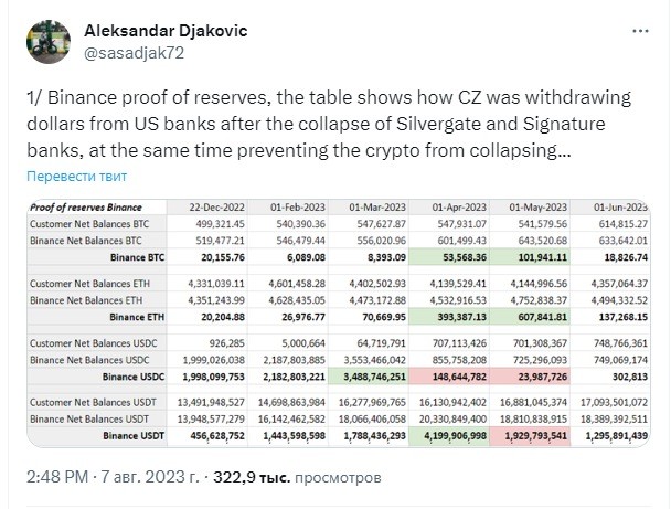 Джакович рассказал, что в начале года Binance конвертировала депонированные пользователями токены $USDC в BUSD, но при этом сохраняла $USDC в резервах. Это подтверждалось расхождением между чистым балансом клиентов и чистым балансом самой биржи, которое на 1 марта составляло $ 3,5 млрд. Произошедшее 12 марта банкротство Signature Bank вызвало изменение стратегии Binance.