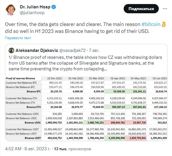 Генеральный директор DeFi-компаний Cake Group и Bake Джулиан Хосп, в свою очередь, предположил, что стремление Binance отказаться от доллара США связано с впечатляющей динамикой биткоина в первой половине 2023 года.