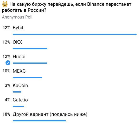 Также мы попросили участников криптосообщества рассказать, на какую биржу они перейдут в случае, если Binance прекратит работу в России. Большинство пользователей проголосовало за Bybit. Криптобиржа получила свыше 40% голосов. Второе место разделили OKX и Huobi. Обе биржи получили по 12% голосов. На третьем месте оказалась MEXC. За вариант проголосовало 10% респондентов.