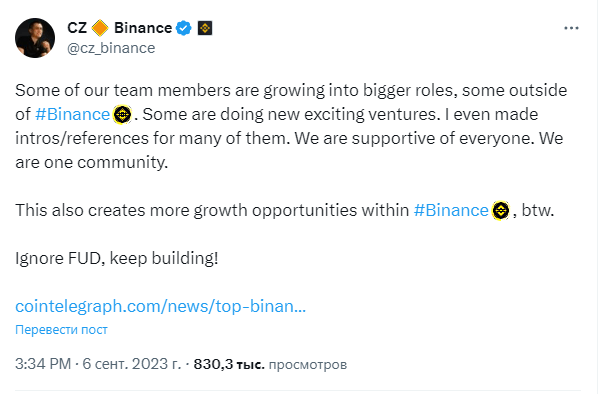 Некоторые члены нашей команды достигают более высоких должностей, причём за пределами Binance, — написал он.
