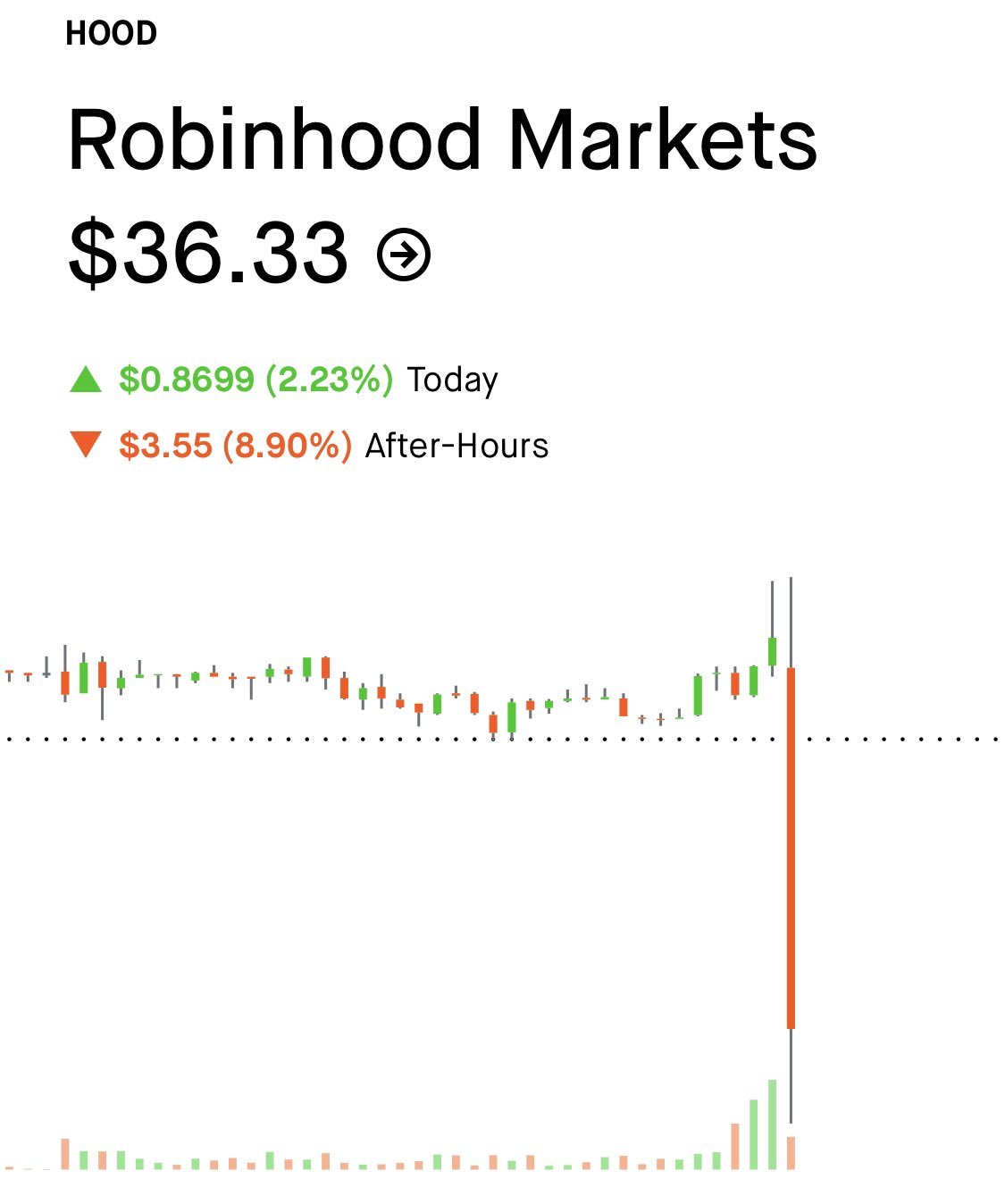 Публикация отчета во вторник совпала с падением HOOD примерно на 10% до 35,70 доллара, однако с тех пор цена выросла на 1,9% до 36,40 доллара. Выручка Robinhood от криптовалюты в прошлом квартале была поддержана сообществом Dogecoin, при этом на долю мемкойнов приходилось 62% доходов от криптовалют.