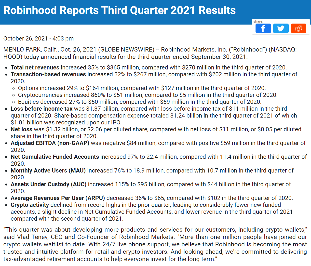 По данным FactSet, чистая выручка компании за квартал составила 365 миллионов долларов, что ниже прогнозов аналитиков, предполагающих, что она составит 437,1 миллиона долларов. Представители Robinhood сообщили о том, что на бизнес повлияли несколько факторов, включая сезонность, волатильность рынка, поведение розничной торговли и непредвиденные рыночные события. В компании сообщили, что эти проблемы могут сохраниться в четвертом квартале.