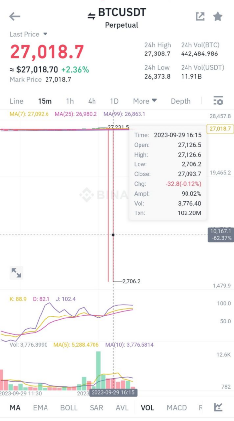 Вчера цена биткоина (BTC) на крупнейшей в мире бирже криптовалют Binance внезапно упала с 27 000 до 2700 долларов. У платформы произошел сбой в API, который привел к временному обвалу.