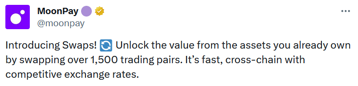 В приложении MoonPay появилась новая функция. Теперь пользователи могут обменивать и переводить криптовалюты между различными блокчейнами. Об этом разработчики сообщили в «Твиттере/Х».