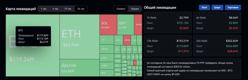 Общая сумма ликвидаций на крипторынке за последние 24 часа превысила 300 млн долларов. Большая часть принудительно закрытых позиций пришлась на BTC и ETH.