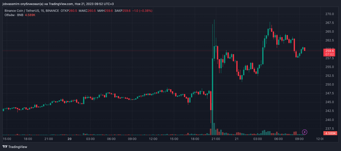На фоне новости курс токена BNB сначала упал ниже $240, но затем резко вырос до приблизительно $270. На момент написания актив торгуется по $259, за сутки прибавив 2,8%.