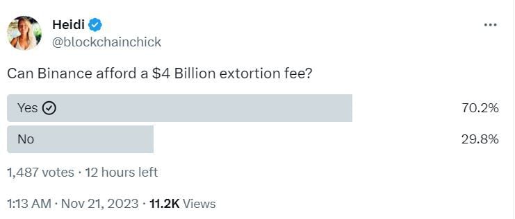 Многие участники криптосообщества считают, что $4 млрд — вполне подъемная сумма для Binance. Например, такого мнения придерживается аналитик TruthLabs. Он считает, что под контролем Binance много теневых организаций, активы которых криптобиржа сможет использовать, чтобы откупиться от DOJ.