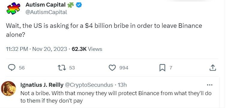 «Стоп, США просит у Binance взятку в размере $4 млрд, чтобы оставить криптобиржу в покое?