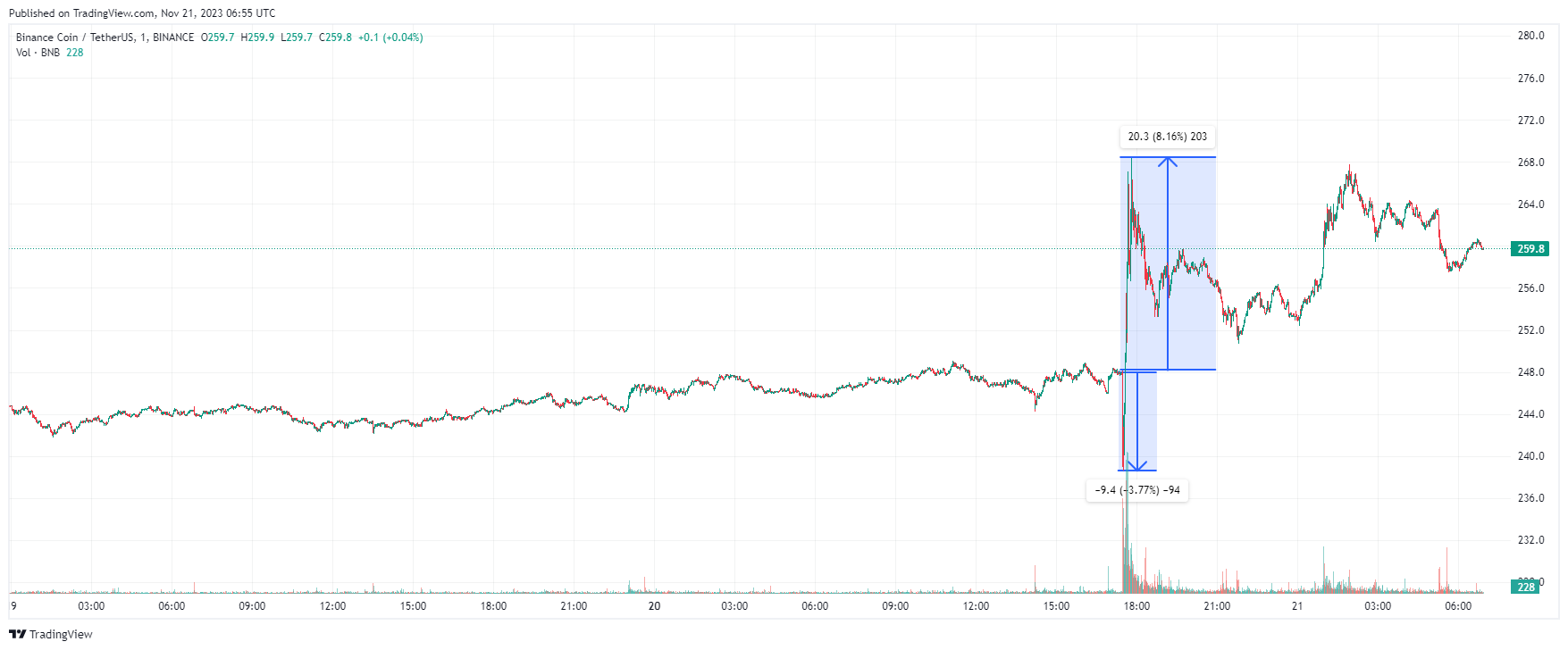 Нативный токен Binance — BNB — на фоне выхода новости сначала скорректировался на 3%, а затем вышел в рост.