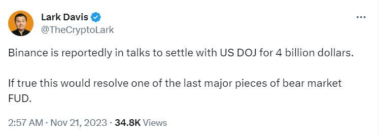 Большинство поддержал популярный в криптосообщества аналитик Ларк Дэвис. По его мнению, Binance не составит труда найти такую сумму для выплат. В своем микроблоге Дэвис обратил внимание на возможные последствия урегулирования конфликта. Он считает, что шаг уничтожит FUD, который подпитывал медведей, а значит — поддержит рост рынка.