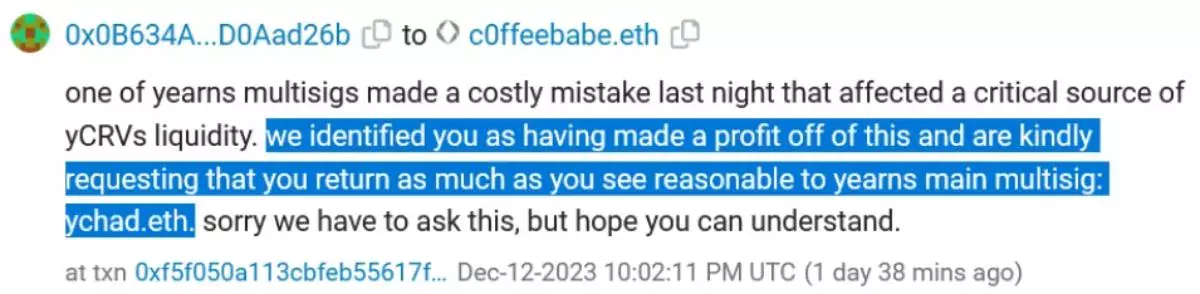 Работники компании отправили сообщения в сети Ethereum (ETH) некоторым удачливым торговцам с призывом перечислить в криптохранилище платформы часть заработанной прибыли. Один из трейдеров, откликнувшихся на их просьбу, перевёл Yearn.finance 2 ETH стоимостью $4520 по текущему курсу.