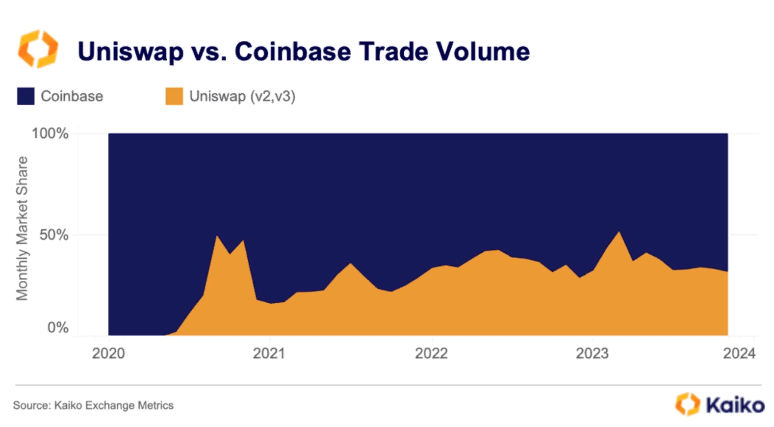 Однако уже в январе 2023 года доля децентрализованных бирж сократилась до 5%. Сейчас она составляет около 3%. Например, платформа Coinbase обрабатывает до 40% с цифровыми валютами.
