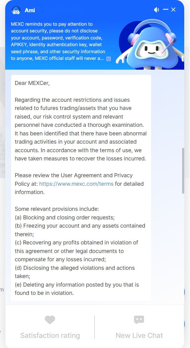 Другими словами, MEXC официально может заблокировать деньги своих пользователей даже без их ведома. При этом причина вроде «аномальной активности» выглядит довольно подозрительно.