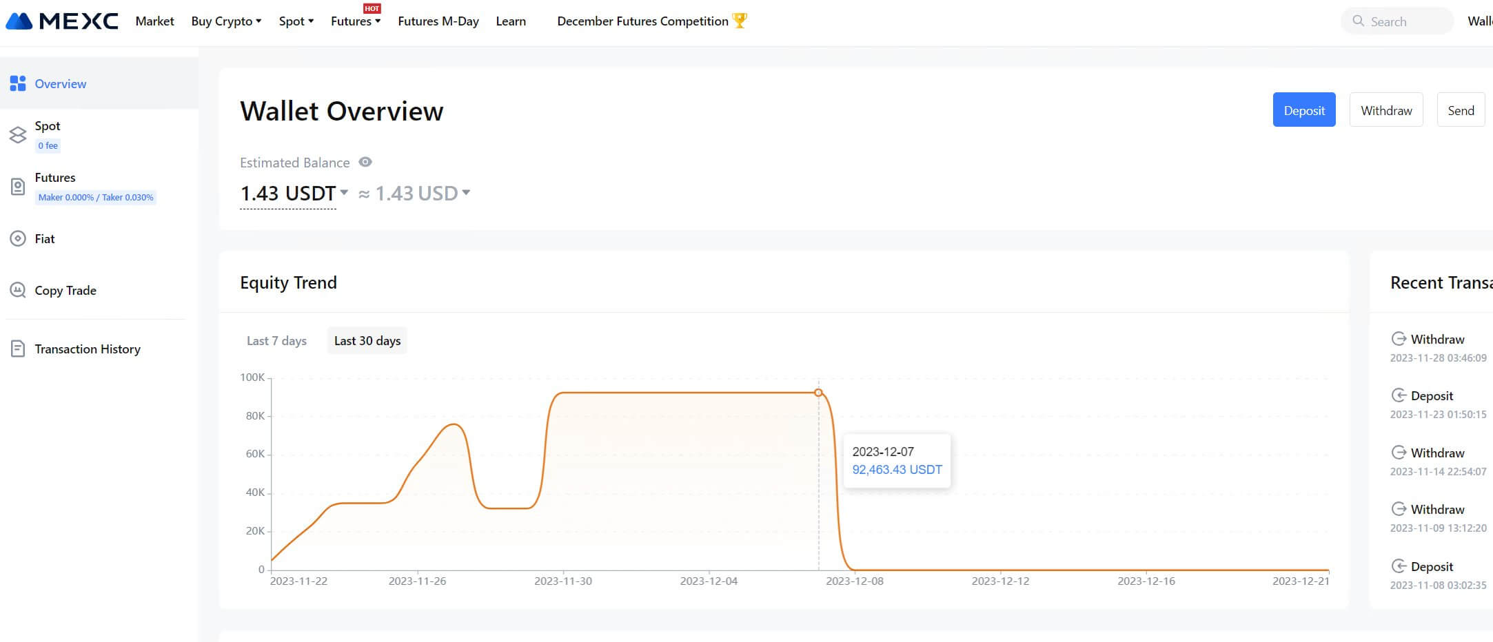 Баланс аккаунта пользователя криптобиржи MEXC под ником Vida