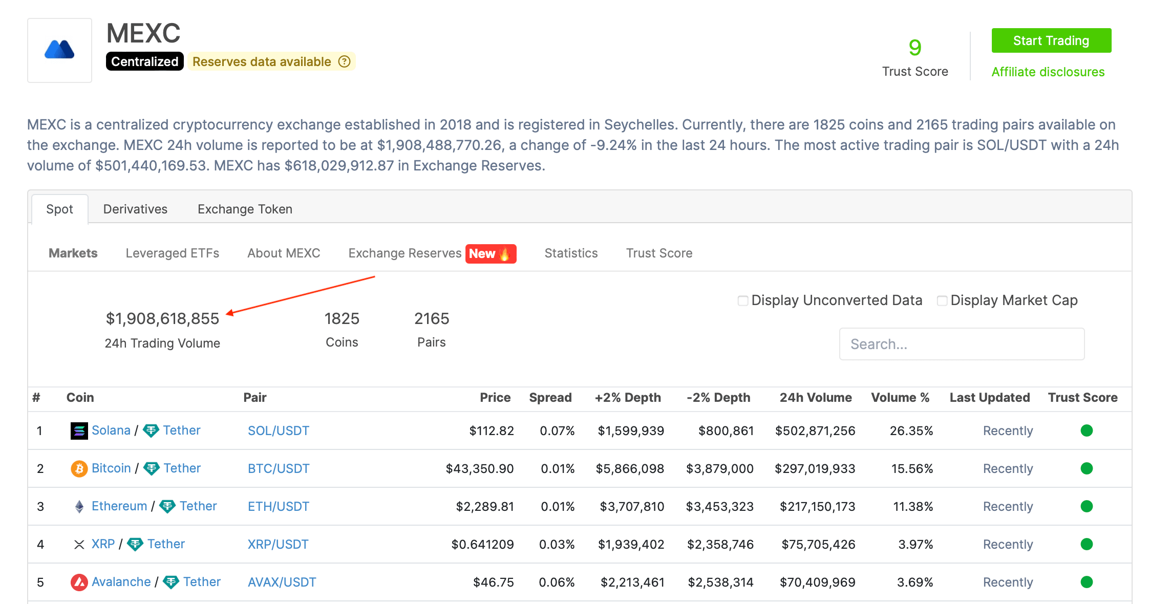 MEXC — популярная криптовалютная биржа, основанная в 2018 году. По данным платформы Coingecko, по состоянию на сегодня на MEXC есть 1825 монет и 2165 торговых пар. За последние сутки общие торговые объёмы на платформе достигли эквивалента 1.9 миллиарда долларов.