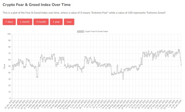 Настроение участников криптовалютного рынка перешло в «нейтральную» зону после почти трех месяцев пребывания в фазе «жадности». Спустя пять дней после одобрения биткоин-ETF индекс страха и жадности опустился с 76 пунктов до 52 из возможных 100, пишет РБК Крипто.