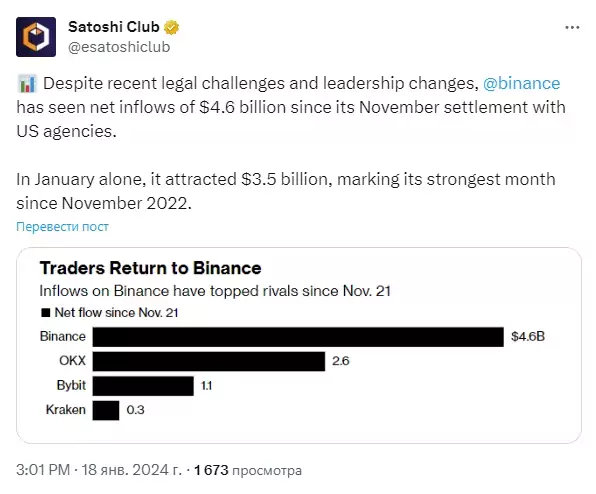С момента урегулирования соглашения с регуляторами США 21 ноября, когда компания признала обвинения в отмывании денег и уклонении от санкций, Binance стала свидетелем чистого притока средств на общую сумму $4,6 млрд (информация от Satoshi Club).