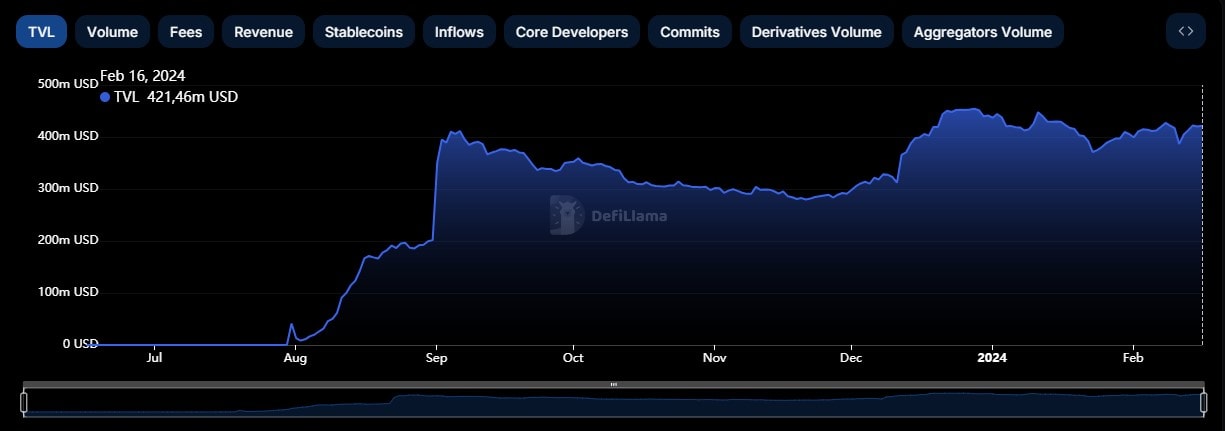 По итогам 2023 года, сеть второго уровня Base от Coinbase стала одной из самых крупных и быстро развивающихся экосистем с 2020 года. По состоянию на 16 февраля 2024 года общая заблокированная стоимость активов (TVL) в сети Base превысила $421 млн, согласно DeFi Llama:
