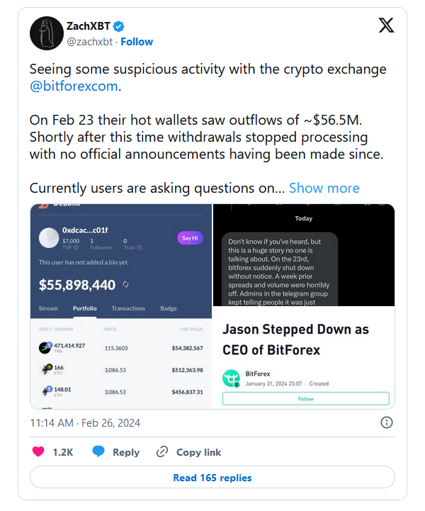 Что произошло? Анонимный исследователь блокчейна под ником ZachXBT отметил подозрительную активность на бирже BitForex. Так, 23 февраля из горячих кошельков BitForex было выведено 56,5 млн долларов, а вскоре после этого платформа остановила обработку операций по выводу средств. С того момента представители компании никак не прокомментировали ситуацию.