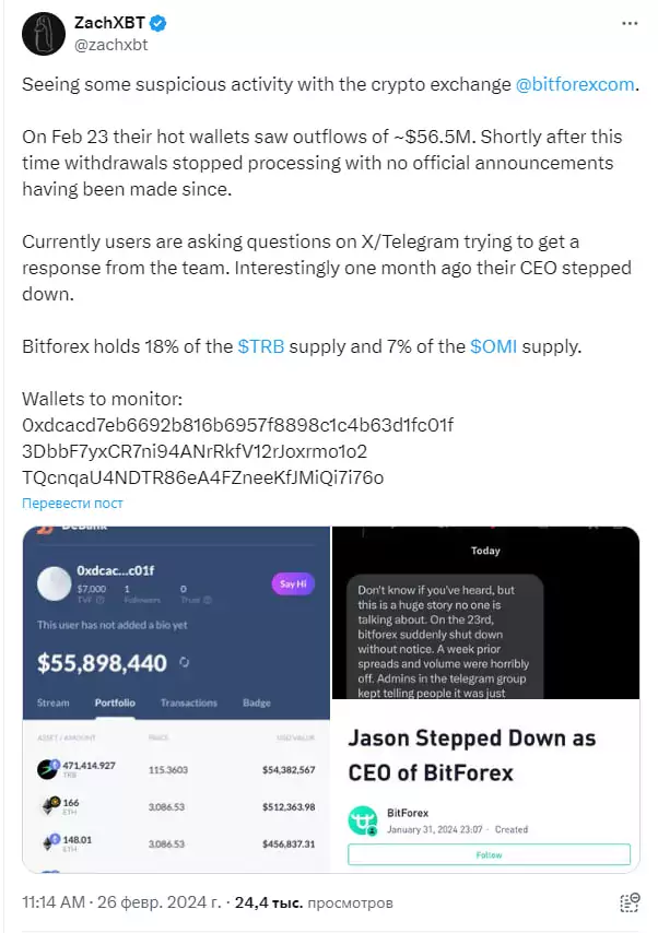 Известный блокчейн-следователь ZachXBT первым сообщил о подозрительной активности, отметив, что криптобиржа деактивировала вывод средств, а часть членов её команды перестала выходить на связь.