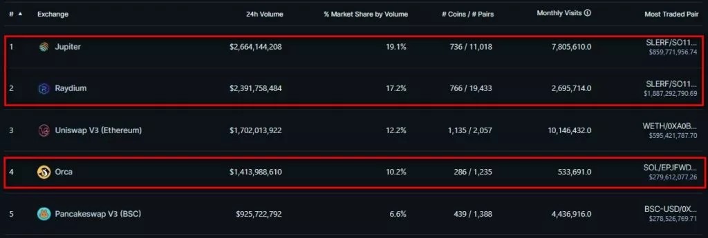 Лидером сегмента стала платформа Jupiter с показателем $2,66 млрд, на второй строчке — Raydium ($2,4 млрд).