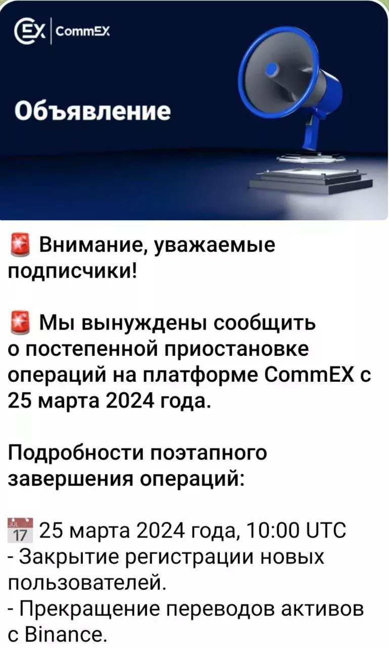 Сегодня в официальном Telegram-канале биржи CommEX появилось объявление о постепенном сворачивании её работы и об окончательном закрытии 10 мая 2024 года.