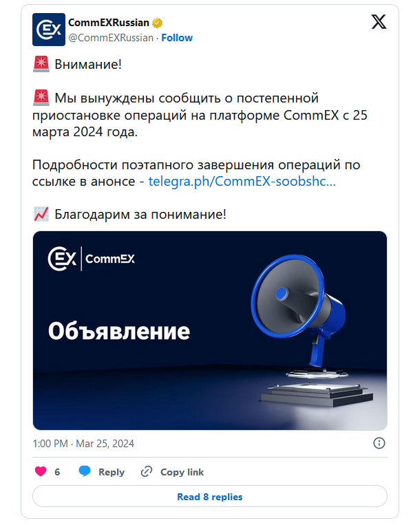 Что произошло? Биржа CommEX, которой Binance в сентябре прошлого года продала свой российский бизнес, объявила о закрытии. Постепенная приостановка операций на платформе началась 25 марта. В CommEX заявили, что решение было принято по итогам «тщательного анализа текущей ситуации и пересмотра стратегических планов».