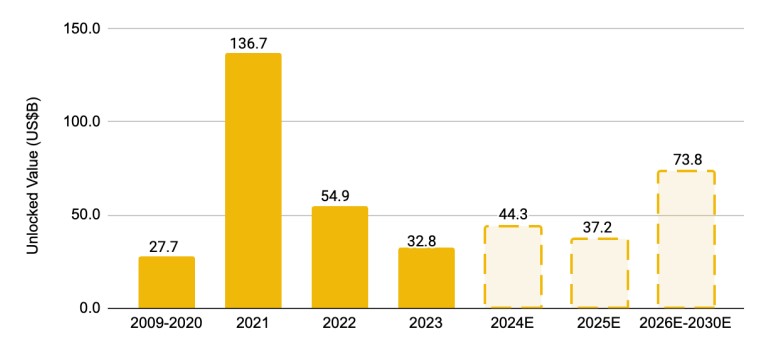 Ссылаясь на данные о разблокировке токенов и данные CoinMarketCap, Binance подсчитала, что в период с 2024 по 2030 год будет разблокировано токенов на сумму около 155 миллиардов долларов.