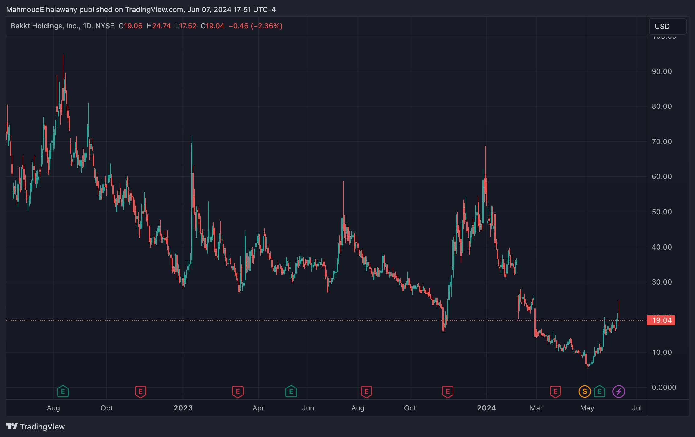 Bakkt страдает от плохих цен на рынке. Цена акций криптокомпании резко упала с максимума в 59,57 долларов в начале 2024 года до примерно 19 долларов на момент написания.