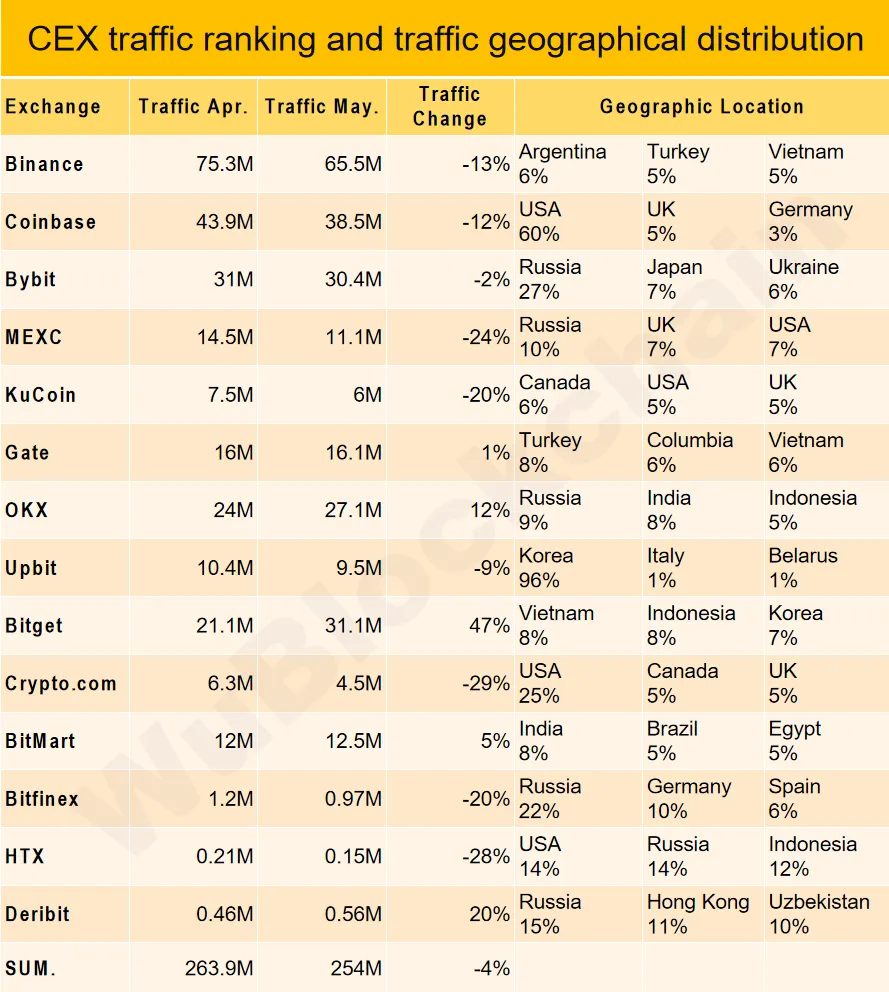 С апреля по май посещаемость основных крупных бирж просела. Общий прирост трафика наблюдался только у OKX, Bitget и Deribit. У последней 10% пользователей за этот период составили жители Узбекистана.