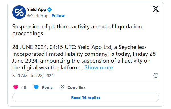 Что произошло? Зарегистрированная на Сейшельских Островах криптоинвестиционная платформа Yield App объявила о немедленном прекращении всех операций 28 июня в рамках подготовки к началу процедуры ликвидации. В официальном заявлении говорится, что решение «принято для обеспечения справедливого отношения ко всем пользователям и акционерам».