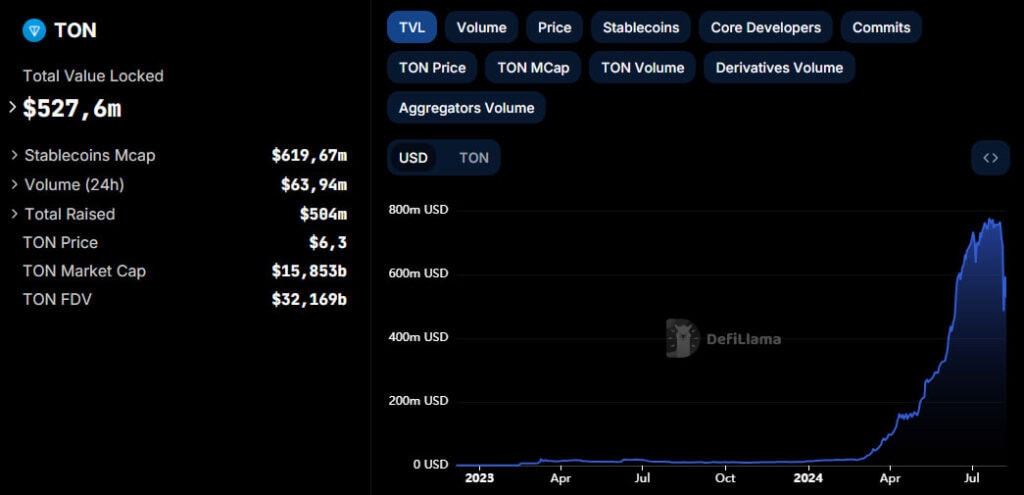 Подчеркнем, общая заблокированная стоимость активов (TVL) в проектах экосистемы The Open Network составляет около $527 млн на момент написания: